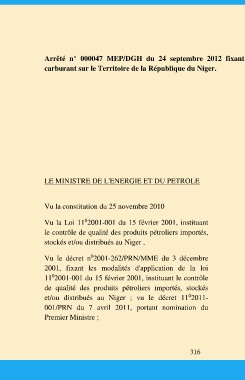 Arrêté n° 000047 MEP/DGH du 24 septembre 2012 fixant les spécifications du GPL